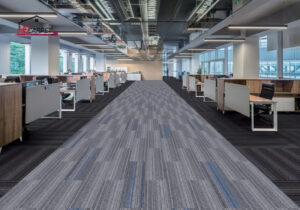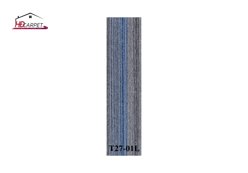 Mẫu Thảm tấm dài T27 01L nổi bật với tông màu xám kết hợp các đường sọc xanh hiện đại, tạo điểm nhấn tinh tế cho sàn nhà. Thiết kế này không chỉ giúp tăng tính thẩm mỹ mà còn hỗ trợ che bụi bẩn và dấu vết di chuyển, rất phù hợp cho khu vực có mật độ đi lại cao như văn phòng, hành lang hoặc khu vực lễ tân.